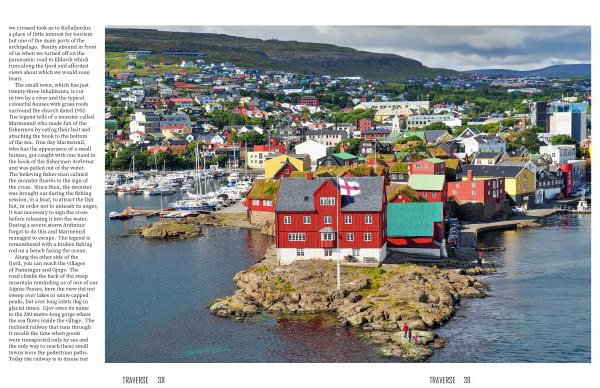 The small town , which has just twenty-three inhabitants , is cut in two by a river and the typical colourful houses with grass roofs surround the church dated 1952 . The legend tells of a monster called Marmennil who made fun of the fishermen by eating their bait and attaching the hook to the bottom of the sea . One day Marmennil , who has the appearance of a small human , got caught with one hand in the hook of the fisherman Anfinnur and was pulled out of the water . The believing fisher-man calmed the monster thanks to the sign of the cross . Since then , the monster was brought out during the fishing session , in a boat , to attract the fish but , in order not to unleash its anger , it was necessary to sign the cross before releasing it into the water . During a severe storm Anfinnur forgot to do this and Marmennil managed to escape . The legend is remembered with a broken fishing rod on a bench facing the ocean . Along the other side of the fjord , you can reach the villages of Funningur and Gjogv . The road climbs the back of the steep mountain reminding us of one of our Alpine Passes ; here the view did not sweep over lakes or snow-capped peaks , but over long inlets dug in glacial times . Gjov owes its name to the 200-metre-long gorge where the sea flows inside the village . The inclined railway that runs through it recalls the time when goods were transported only by sea and the only way to reach these small towns were the pedestrian paths . Today the railway is in disuse but