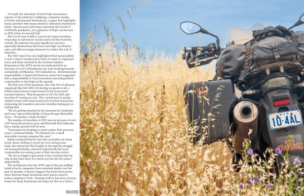 Annually the Adventure Travel Trade Association reports on the industry ’ s wellbeing , consumer trends , activities and planned destinations , a paper that highlights many activities with many related to adventure motorcycle travel . Recent years have been tainted by the Covid-19 worldwide pandemic , yet a glimmer of hope can be seen as 2022 enters its second half .