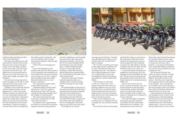 Ladakh is close to both the Chinese and the Pakistan borders and is a disputed area . There was a huge military presence around Leh , and we were continually tussling with convoys of Army trucks . We passed large Army camps then started to make our way into the countryside . We rode through the first of many checkpoints . Sandy was riding as tail-end Charlie and was stopped by