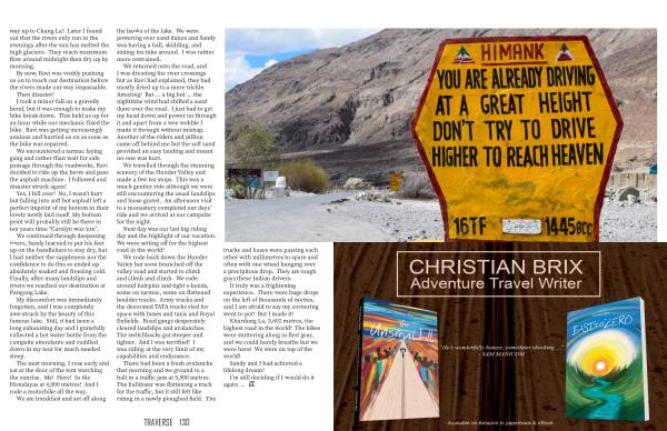 We rode back down the Hunder Valley but soon branched off the valley road and started to climb and climb and climb . We rode around hairpins and tight s-bends , some on tarmac , some on flattened boulder tracks . Army trucks and the decorated TATA trucks vied for space with buses and taxis and Royal Enfields . Road gangs desperately cleared landslips and avalanches . The switchbacks got steeper and tighter . And I was terrified ! I was riding at the very limit of my capabilities and endurance .