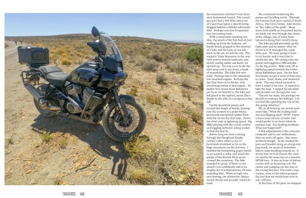 The bike purred smoothly up the Gydo pass and no matter what we threw at it , it managed the roads with ease . We were going to have to try harder and it was time to smash the dirt . We swung onto the gravel and toggled to Offroad plus on the big screen . Mike took off at lightning speed towards the rather steep Katbakkies pass . On the first few bends , we got a taste of what was to come . Sand , stone , and shattered shale . The rear wheel seemed to have a mind of its own . It wanted to take the lead . I tapped his shoulder and shouted out through the roar .