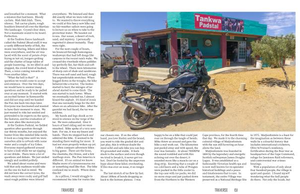 happy to be on a bike that could just roar on through the tangle of bends . Mike threw us around and gave the bike a real work out . The kilometres just peeled away and with speed , the roar was fantastic . At about 7000RPM the sound rumbled and with this echoing out over the desert , it sounded more like a muscle car on a drag strip . Knowing that a couple of ice-cold beers and a tube of Pringles were packed in the little cooler in the top case with ice packs , we did no more stops and just pushed down from the Northern to the Western