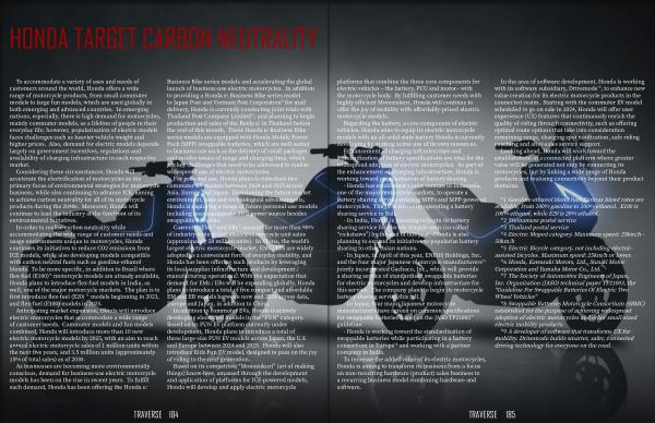 Considering these circumstances , Honda will accelerate the electrification of motorcycles as the primary focus of environmental strategies for motorcycle business , while also continuing to advance ICE , aiming to achieve carbon neutrality for all of its motorcycle products during the 2040s . Moreover , Honda will continue to lead the industry at the forefront of its environmental initiatives .