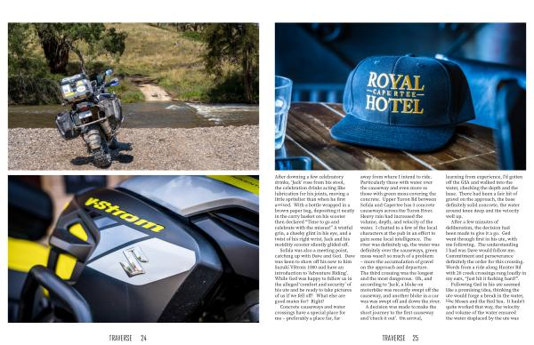 away from where I intend to ride . Particularly those with water over the causeway and even more so those with green moss covering the concrete . Upper Turon Rd between Sofala and Capertee has 3 concrete causeways across the Turon River . Heavy rain had increased the volume , depth , and velocity of the water . I chatted to a few of the local characters at the pub in an effort to gain some local intelligence . The river was definitely up , the water was definitely over the causeways , green moss wasn ’ t so much of a problem – more the accumulation of gravel on the approach and departure . The third crossing was the longest and the most dangerous . Oh , and according to ‘ Jack ’, a bloke on motorbike was recently swept off the causeway , and another bloke in a car was was swept off and down the river .