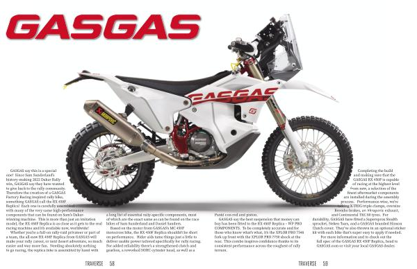 GASGAS say this is a special one ! Since Sam Sunderland ’ s history-making 2022 Dakar Rally win , GASGAS say they have wanted to give back to the rally community . Therefore the creation of a GASGAS Factory Racing inspired rally bike , something GASGAS call the RX 450F Replica ! Each one is carefully assembled with many of the very same high-performance components that can be found on Sam ’ s Dakarwinning machine . This is more than just an imitation model , the RX 450F Replica is as close as it gets to the real racing machine and it ’ s available now , worldwide !