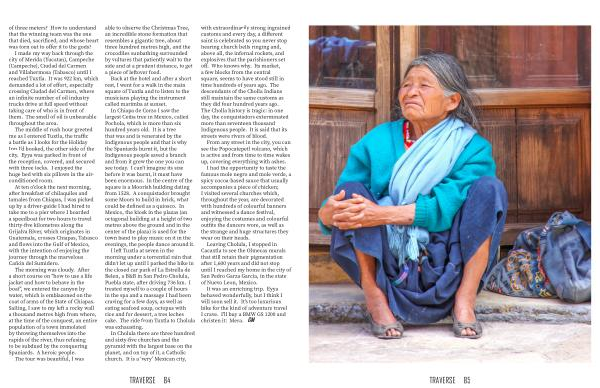 In Cholula there are three hundred and sixty-five churches and the pyramid with the largest base on the planet , and on top of it , a Catholic church . It is a ‘ very ’ Mexican city , with extraordinarily strong ingrained customs and every day , a different saint is celebrated so you never stop hearing church bells ringing and , above all , the infernal rockets , and explosives that the parishioners set off . Who knows why . Its market , a few blocks from the central square , seems to have stood still in time hundreds of years ago . The descendants of the Cholla Indians still maintain the same customs as they did four hundred years ago . The Cholla history is tragic : in one day , the conquistadors exterminated more than seventeen thousand Indigenous people . It is said that its streets were rivers of blood .