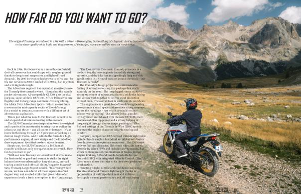" The look revives the classic Transalp presence in a modern key , the new engine is incredibly strong and versatile , and the bike has an appealingly long and rich specification list . Around town or around the world – our Transalp is ready !”