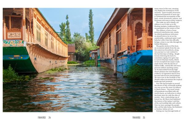 The gentle motion of the boat , an occasional splash from the oar , the numerous houseboats , along our journey is a vast contrast to the last few days of riding . Rough terrain following the bed of a sometimes raging river gave way to narrow bitumen tracks , which in turn morphed into major roads made hectic with the throws of Indian traffic , animal life and every present soldiers standing sentry . As we descended from the high desert plateaus the land displayed evidence of vegetation which soon became lush forests and farmland . We were now in the foothills of the World ’ s tallest mountains the tropical landscape had resumed .