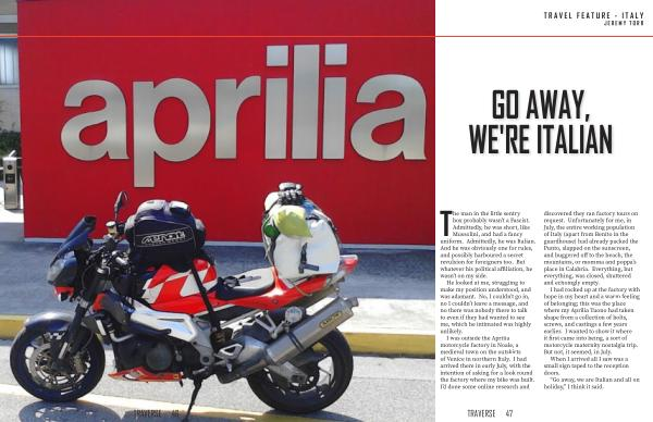 I was outside the Aprilia motorcycle factory in Noale , a medieval town on the outskirts of Venice in northern Italy . I had arrived there in early July , with the intention of asking for a look round the factory where my bike was built . I ’ d done some online research and discovered they ran factory tours on request . Unfortunately for me , in July , the entire working population of Italy ( apart from Benito in the guardhouse ) had already packed the Punto , slapped on the sunscreen , and buggered off to the beach , the mountains , or momma and poppa ’ s place in Calabria . Everything , but everything , was closed , shuttered and echoingly empty .