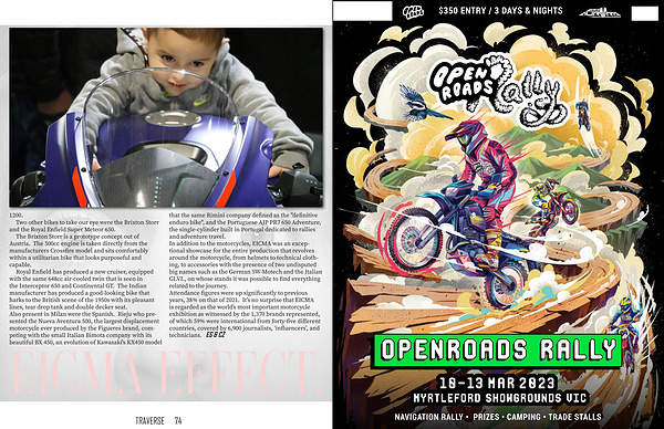 that the same Rimini company defined as the " definitive enduro bike ", and the Portuguese AJP PR7 650 Adventure , the single-cylinder built in Portugal dedicated to rallies and adventure travel . In addition to the motorcycles , EICMA was an exceptional showcase for the entire production that revolves around the motorcycle , from helmets to technical clothing , to accessories with the presence of two undisputed big names such as the German SW-Motech and the Italian GI . VI ., on whose stands it was possible to find everything related to the journey . Attendance figures were up significantly to previous years , 38 % on that of 2021 . It ’ s no surprise that EICMA is regarded as the world ’ s most important motorcycle exhibition as witnessed by the 1,370 brands represented , of which 59 % were international from forty-five different countries , covered by 6,900 journalists , ‘ influencers ’, and technicians . ES & CZ