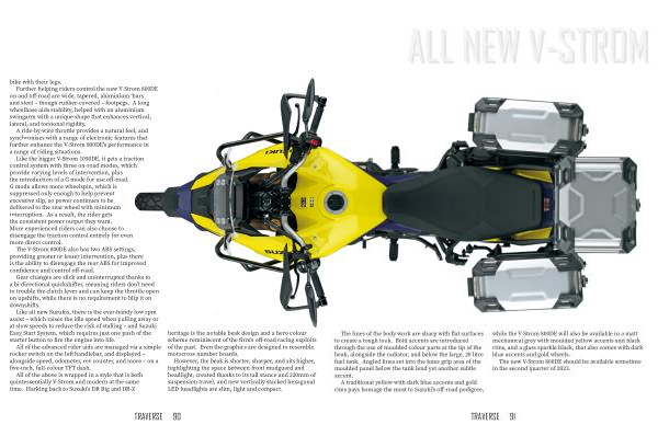 All of the above is wrapped in a style that is both quintessentially V-Strom and modern at the same time . Harking back to Suzuki ’ s DR Big and DR-Z heritage is the notable beak design and a hero colour scheme reminiscent of the firm ’ s off-road racing exploits of the past . Even the graphics are designed to resemble motocross number boards .