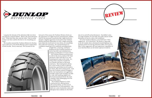 The Trailmax Mission performs just as well on the more common ‘ dirt ’ that adventure riders will take it on , well formed gravel roads or fire trails . No airing down required , it performs as it should , but then so will most road tyres . The tread pattern allows for a level of bite as well as sidewall protection , good when you do need to air down , like sand or deep gravel . And here the Trailmax mission struggles a little , the tread pattern not aggressive enough to dig in and certainly not able to cope with anything slightly wet , the tread just doesn ’ t throw the mud creating a slick challenging even the best of the riders .