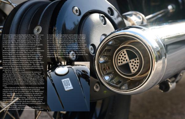 The R 18 100 Years is complemented by numerous chrome parts from the Chrome design option . The high-quality and durable galvanic surface coating can be found on these parts : Handlebar fittings , gearshift and foot brake levers , handlebar clamps , handlebar weights , mirrors , brake master cylinders , brake calipers , engine casing covers , cylinder head covers and intake manifold trims .