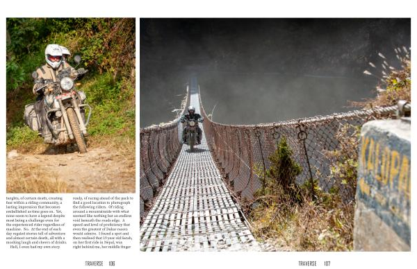 heights , of certain death , creating fear within a riding community , a lasting impression that becomes embellished as time goes on . Yet , none seem to have a legend despite most being a challenge even for the experienced rider regardless of machine . No . At the end of each day regaled stories tell of adventure and almost certain death , all with a mocking laugh and cheers of drinks . Hell , I even had my own story ready , of racing ahead of the pack to find a good location to photograph the following riders . Of riding around a mountainside with what seemed like nothing but an endless void beneath the roads edge . A speed and level of proficiency that even the greatest of Dakar racers would admire . I found a spot and then realised that 19 year old Sarah , on her first ride in Nepal , was right behind me , her middle finger