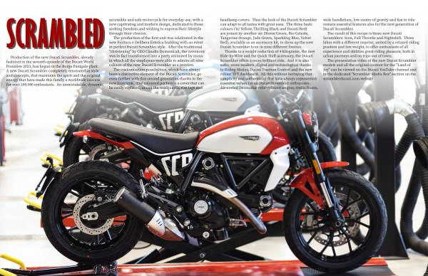 Production of the new Ducati Scrambler , already featured in the seventh episode of the Ducati World Première 2023 , has begun in the Borgo Panigale plant . A new Ducati Scrambler completely renovated in style and concepts , that maintains the spirit and the original energy that have made this family a worldwide success for over 100,000 enthusiasts . An unmistakable , dynamic , accessible and safe motorcycle for everyday use , with a new captivating and modern design , dedicated to those seeking freedom and wishing to express their lifestyle through their choices .