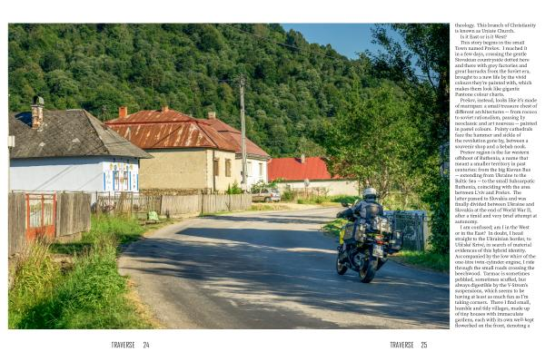 I am confused ; am I in the West or in the East ? In doubt , I head straight to the Ukrainian border , to Uličské Krivé , in search of material evidences of this hybrid identity . Accompanied by the low whirr of the one-litre twin-cylinder engine , I ride through the small roads crossing the beechwood . Tarmac is sometimes pebbled , sometimes scuffed , but always digestible by the V-Strom ’ s suspensions , which seems to be having at least as much fun as I ’ m taking corners . There I find small , humble and tidy villages , made up of tiny houses with immaculate gardens , each with its own well-kept flowerbed on the front , denoting a