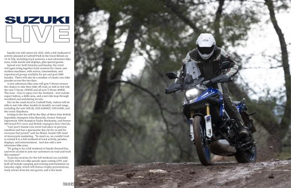 Suzuki Live will return for 2023 , with a full weekend of activity planned at Cadwell Park in the Great Britain on 15-16 July , including track sessions , a new adventure bike zone , trade stands and displays , plus special guests .