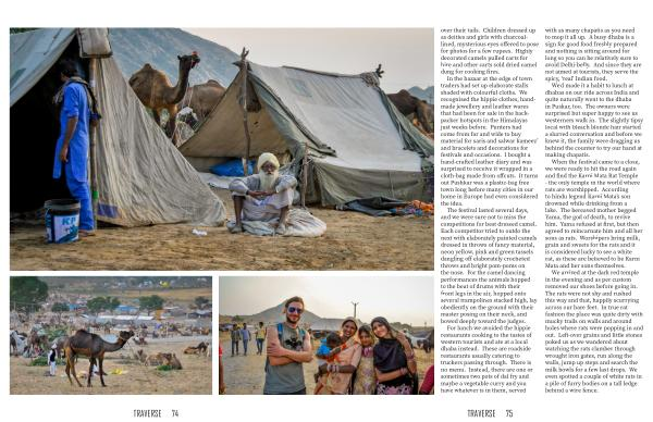 In the bazaar at the edge of town traders had set up elaborate stalls shaded with colourful cloths . We recognised the hippie clothes , handmade jewellery and leather wares that had been for sale in the backpacker hotspots in the Himalayas just weeks before . Punters had come from far and wide to buy material for saris and salwar kameez ’ and bracelets and decorations for festivals and occasions . I bought a hand-crafted leather diary and was surprised to receive it wrapped in a cloth-bag made from offcuts . It turns out Pushkar was a plastic-bag free town long before many cities in our home in Europe had even considered the idea .