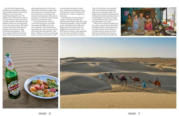 Our luck duly topped up we headed west to Jaisalmer , finding camp hidden deeply in the thorny thickets of acacia trees and euphorbias along the way . The ‘ Golden City ’ at the western edge of the Thar Desert is often perceived as India ’ s guard to the frontier with Pakistan and traces its beginnings back to the 12th century . We found a hostel with views of the famous Jaisalmer fort from its rooftop restaurant and settled in . The Sonar Quila ( Golden Fort ) houses shops , hotels and ancient havelis