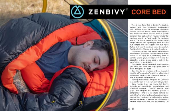 The all-new Core Bed is Zenbivy ' s simplest , softest , and most affordable backpacking bed . Without zippers or a complex convertible footbox , the Core Bed ’ s simple patent-pending Fast Footbox™ utilises just one hook to quickly transform the footbox from " mummy mode " for maximum warmth to “ wide mode ” for maximum space . The proven draft-free clip system keeps things minimal and lightweight while the soft 50d Pongee liner and supple new 30d Nylon Taffeta shell provide maximum home-like comfort . Available in 650-fill down and synthetic options .