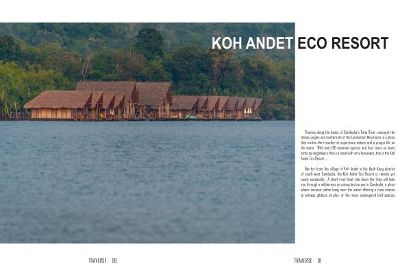 Floating along the banks of Cambodia ’ s Tatai River , amongst the dense jungles and rainforests of the Cardamom Mountains is a place that invites the traveller to experience nature and a unique life on the water . With over 100 mammal species and four times as many birds as neighbours this is a hotel with very few peers , this is the Koh Andet Eco Resort …