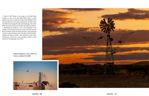Interpreting the sculptures is left to the imagination of the traveller , yet it ' s hard to go past the aircraft , now home to many birds of the desert , and the inscription upon them . A short walk away is what can only be the patron saint of travellers , Saint Christopher , complete with child on shoulder . Constructed from various motor vehicle parts , St Chris has a huge appendage , perhaps a social comment on the happenings of the church .