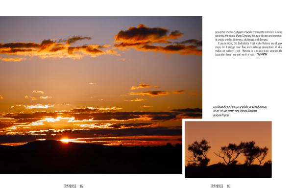 If you ' re riding the Oodnadatta Track make Mutonia one of your stops , let it disrupt your flow and challenge conceptions of what makes an outback track . Mutonia is a unique place amongst the Australian desert and well worth a visit . TRAVERSE