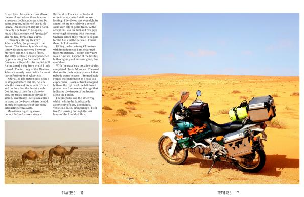 After a 780 kilometre ride I decide to stop just before Dakhla , on one side the waves of the Atlantic Ocean and on the other the desert sands . Continuing to look for a place to stay , my trusty camera is always in action . Eventually I settle on a place to camp on the beach where I could admire the acrobatics of the many kitesurfing enthusiasts .