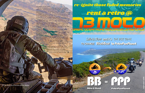 I encourage those on future rides to consider doing a reading or sharing their story especially if they have served and thankyou to all those veterans and riders who became involved in the tributes this year . Not only does this ride help raise money for Soldier On it also allows a platform for people to ask veterans questions and hear their experiences which can be cathartic for those that have served . This ride was also a perfect opportunity for my teenage son and I to spend some great time together , away from it all , which we will both remember forever . I ’ m already looking forward to the 2024 edition of the Frontline Safari , for 2023 was an unexpected , thoroughly enjoyable , experience . And to put it into dirt bike terms , it was one hell of a ride . RH