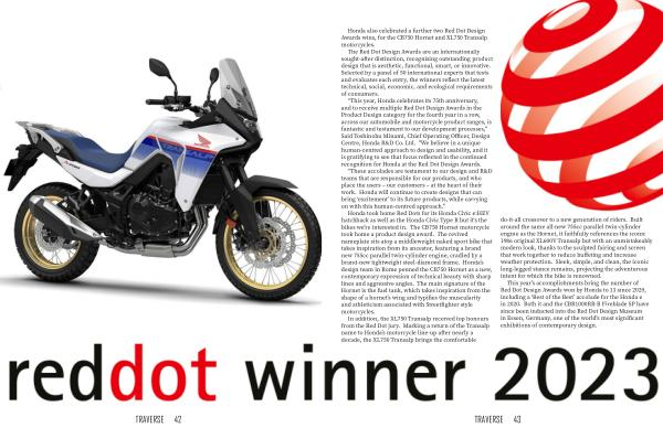 Honda took home Red Dots for its Honda Civic e : HEV hatchback as well as the Honda Civic Type R but it ' s the bikes we ' re interested in . The CB750 Hornet motorcycle took home a product design award . The revived nameplate sits atop a middleweight naked sport bike that takes inspiration from its ancestor , featuring a brand new 755cc parallel twin-cylinder engine , cradled by a brand-new lightweight steel-diamond frame . Honda ’ s design team in Rome penned the CB750 Hornet as a new , contemporary expression of technical beauty with sharp lines and aggressive angles . The main signature of the Hornet is the fuel tank , which takes inspiration from the shape of a hornet ’ s wing and typifies the muscularity and athleticism associated with Streetfighter style motorcycles .