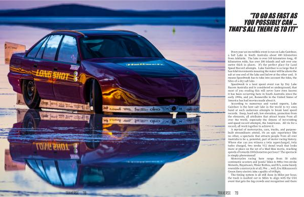 A myriad of motorcycles , cars , trucks , and purposebuilt streamliners attend , it ’ s an epic experience like no other , a spectacle that attracts people from all over Australia to be a , potential , part of motor racing history . Where else can you witness a twin supercharged , twin turbo charged , two stroke V12 diesel truck that looks more at place on the set of a Mad Max movie , reaching speeds of towards 330 kilometres per hour ? The spectacle is simply phenomenal !