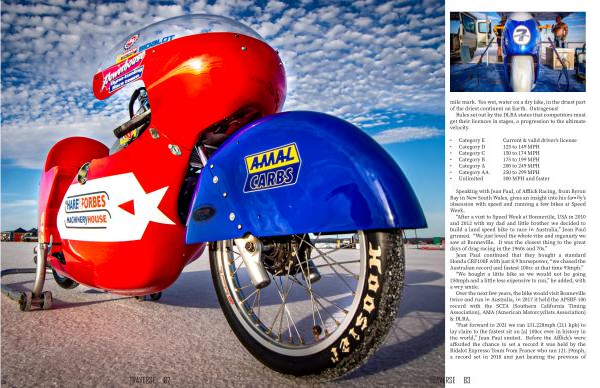 “ After a visit to Speed Week at Bonneville , USA in 2010 and 2012 with my dad and little brother we decided to build a land speed bike to race in Australia ,” Jean Paul grinned . “ We just loved the whole vibe and ingenuity we saw at Bonneville . It was the closest thing to the great days of drag racing in the 1960s and 70s .”
