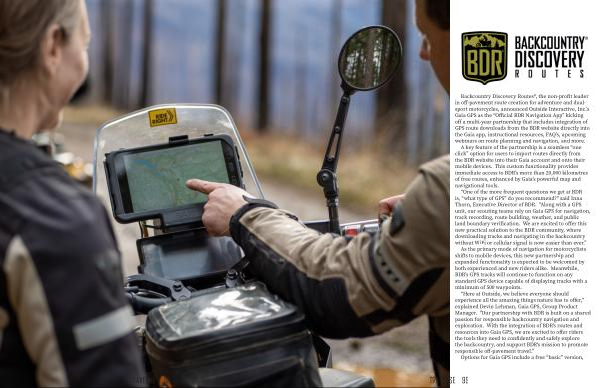 “ Here at Outside , we believe everyone should experience all the amazing things nature has to offer ," explained Devin Lehman , Gaia GPS , Group Product Manager . " Our partnership with BDR is built on a shared passion for responsible backcountry navigation and exploration . With the integration of BDR ' s routes and resources into Gaia GPS , we are excited to offer riders the tools they need to confidently and safely explore the backcountry , and support BDR ' s mission to promote responsible off-pavement travel .”