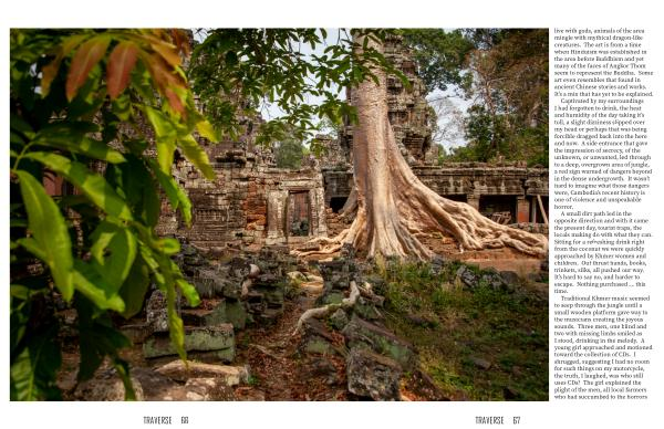 Traditional Khmer music seemed to seep through the jungle until a small wooden platform gave way to the musicians creating the joyous sounds . Three men , one blind and two with missing limbs smiled as I stood , drinking in the melody . A young girl approached and motioned toward the collection of CDs . I shrugged , suggesting I had no room for such things on my motorcycle , the truth , I laughed , was who still uses CDs ? The girl explained the plight of the men , all local farmers who had succumbed to the horrors