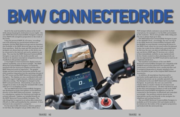Head for the most beautiful locations in the world while always keeping the destination in your sights - the new BMW Motorrad ConnectedRide Navigator connects every BMW with navigation preparation to the roads of the world .