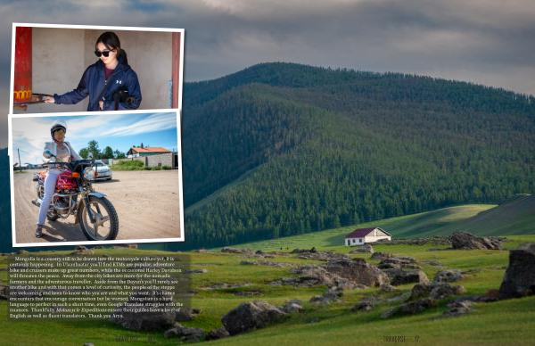 Mongolia is a country still to be drawn into the motorcycle culture yet , it is certainly happening . In Ulaanbaatar you ’ ll find KTMs are popular , adventure bike and cruisers make up great numbers , while the occasional Harley Davidson will threaten the peace . Away from the city bikes are more for the nomadic farmers and the adventurous traveller . Aside from the Dayun ’ s you ’ ll rarely see another bike and with that comes a level of curiosity , the people of the steppe are welcoming and keen to know who you are and what you want . It ’ s chance encounters that encourage conversation but be warned , Mongolian is a hard language to perfect in such a short time , even Google Translate struggles with the nuances . Thankfully Motorcycle Expeditions ensure their guides have a level of English as well as fluent translators . Thank you Arya .