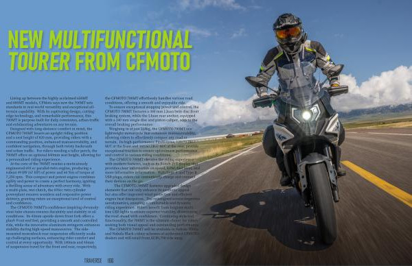 The CFMOTO 700MT features upgraded design elements that not only enhance its aesthetic appeal but also offer improved wind protection and efficient engine heat dissipation . The redesigned screen improves aerodynamics , ensuring a comfortable and dynamic riding experience . Riders benefit from brighter multiline LED lights to ensure superior visibility , illuminating the road ahead with confidence . Combining style and functionality , the 700MT is the ultimate choice for riders seeking both visual appeal and outstanding performance .