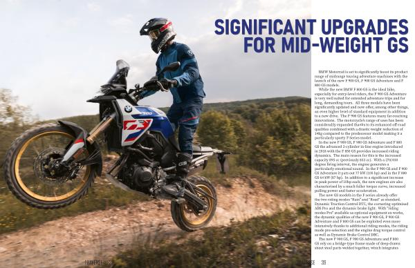 While the new BMW F 800 GS is the ideal bike , especially for entry-level riders , the F 900 GS Adventure is very well suited for extended adventure trips and for long , demanding tours . All three models have been significantly updated and now offer , among other things , an even higher level of standard equipment in addition to a new drive . The F 900 GS features many far-reaching innovations . The motorcycle ’ s range of uses has been considerably expanded thanks to its enhanced off-road qualities combined with a drastic weight reduction of 14kg compared to the predecessor model making it a particularly sporty F Series model .