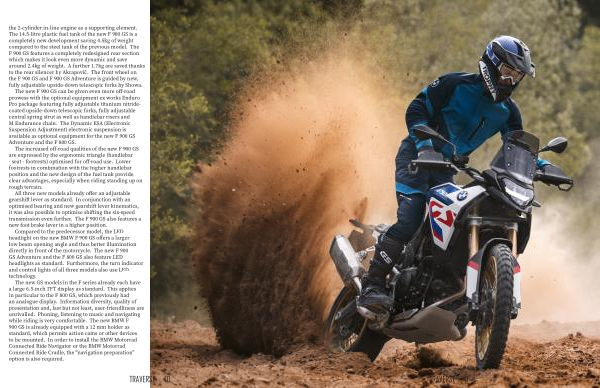 the 2-cylinder in-line engine as a supporting element . The 14.5-litre plastic fuel tank of the new F 900 GS is a completely new development saving 4.5kg of weight compared to the steel tank of the previous model . The F 900 GS features a completely redesigned rear section which makes it look even more dynamic and save around 2.4kg of weight . A further 1.7kg are saved thanks to the rear silencer by Akrapovič . The front wheel on the F 900 GS and F 900 GS Adventure is guided by new , fully adjustable upside-down telescopic forks by Showa . The new F 900 GS can be given even more off-road prowess with the optional equipment ex works Enduro Pro package featuring fully adjustable titanium nitridecoated upside-down telescopic forks , fully adjustable central spring strut as well as handlebar risers and M Endurance chain . The Dynamic ESA ( Electronic Suspension Adjustment ) electronic suspension is available as optional equipment for the new F 900 GS Adventure and the F 800 GS .