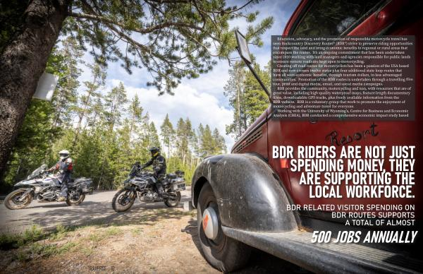 Creating off road routes for motorcyclists has been a passion of the USA based BDR and now crosses twelve states plus four additional state loop routes that have all seen economic benefits , through tourism dollars , in less advantaged communities . Promotion of the BDR routes is undertaken through a travelling film tour , print and digital media , email , and social media campaigns .