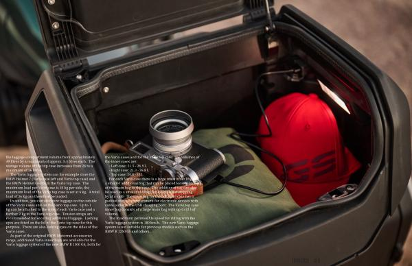 As part of the original BMW Motorrad accessories range , additional Vario inner bags are available for the Vario luggage system of the new BMW R 1300 GS , both for the Vario cases and for the Vario top case . The volumes of the inner cases are : - Left case : 21.5 - 28.9 l . - Right case : 21.3 - 26.8 l . - Top case : 24.8 - 33 l . For each Vario case there is a large main inner bag and a smaller additional bag that can be placed loosely on top of the main bag in the case . The additional bag can also be used as a small handbag , for example for stopping by at a café . The main bag for the left Vario case has a padded storage compartment for electronic devices with cable outlet to the USB charging port . The Vario top case inner bag consists of a large main bag with up to 33 l of volume .