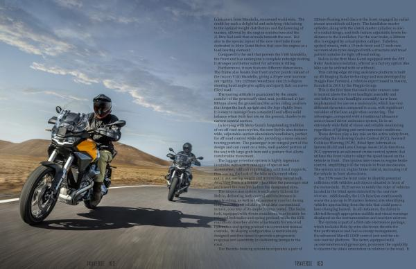 fabricators from Mandello , renowned worldwide . The credit for such a delightful and satisfying ride belong to the optimal weight distribution and the lowering of masses , allowed by the engine architecture and the 21-litre fuel tank that extends beneath the seat . But also to the special layout of the new steel tube frame dedicated to Moto Guzzi Stelvio that uses the engine as a load-bearing element .