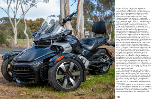 Everything combined allows for fast corner entry however , a little planning is required , a level of subtlety helps the cause and keeps the bike feeling planted , aggression startles the beast , and it feels as though it could bight back . Road holding overall is exceptional however the three-wheeled configuration does tend to follow the contours of the surface , on more than one occasion we felt that the bike wanted to drag us off the road , and combined with a strong gust of wind we almost did . It comes about from the Can Am ’ s front wheels constantly looking for the easier options , the road ’ s low spots . Controlling a Can Am means constant inputs from the rider , adjusting bar position and looking well ahead , increase the speed and greatly levels of input are required . A riders upper body does all of the work .