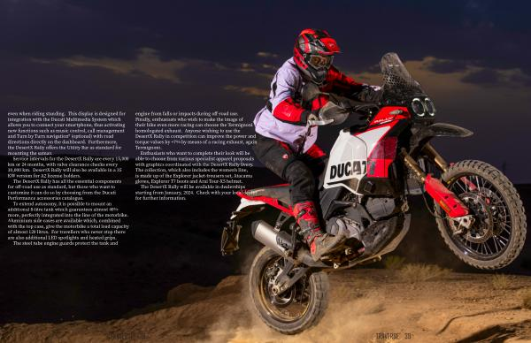 The steel tube engine guards protect the tank and engine from falls or impacts during off-road use . Finally , enthusiasts who wish to make the image of their bike even more racing can choose the Termignoni homologated exhaust . Anyone wishing to use the DesertX Rally in competition can improve the power and torque values by + 7 % by means of a racing exhaust , again Termignoni .