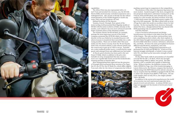 capabilities . The Africa Twin was also represented with a 21- inch front and included two versions , one , the ES with Showa EERA electronically controlled suspension and a redesigned front . Also of note at Honda was the radical reinterpretation of the NX500 designed to tackle any route , both road and moderate off road . Refined Evolution Of The Species Yamaha , Ducati , Triumph , three giants of the motorcycling world presented their flagship models at EICMA with the latest evolution of bikes already on the market , each refined to be even more advanced and with hopes of greater share of the adventure market .