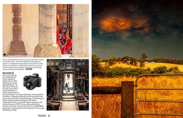 WIN A NIKON Z50 Send us your favourite travel photograph and the one regarded as the best will win a Nikon Z50 mirrorless camera and 18-140mm lens . The Z50 is Nikon ' s DX format mirroless camera that is packed with features , a perfect companion for any motorcycle traveller , it ' s compact , lightweight , and protected from the weather . Photographs submitted must be the copyright of the person entering and must include all meta data . Post processing is allowed , digital manipulation including AI is NOT allowed . Images must be sent to - traverse @ traverse-magazine . com and received by January 31 , 2024 . Entries will be accepted from anywhere in the world . The total value of the prize is AU $ 2,299.95 plus postage . The winning entry will be announced in Traverse issue 40 ( February 14 , 2024 ).