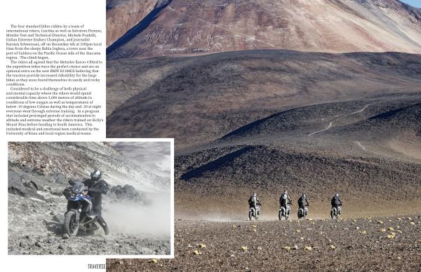 The four standard bikes ridden by a team of international riders , Lischka as well as Salvatore Pennisi , Metzler Test and Technical Director , Michele Pradelli , Italian Extreme Enduro Champion , and journalist Karsten Schwersset , off on December 6th at 3:00pm local time from the sleepy Bahia Inglesa , a town near the port of Caldera on the Pacific Ocean side of the Atacama region . The climb began .