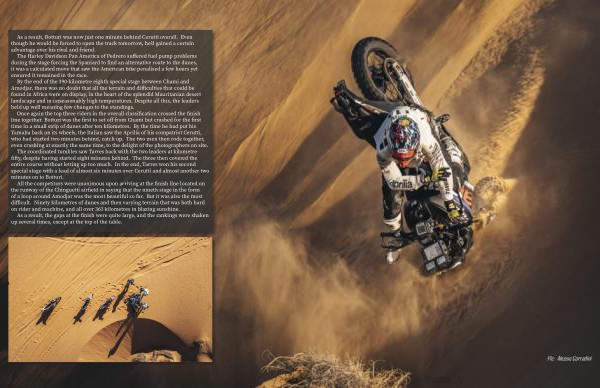 Once again the top three riders in the overall classification crossed the finish line together . Botturi was the first to set off from Chami but crashed for the first time in a small strip of dunes after ten kilometres . By the time he had put his Yamaha back on its wheels , the Italian saw the Aprilia of his compatriot Cerutti , who had started two minutes behind , catch up . The two men then rode together , even crashing at exactly the same time , to the delight of the photographers on site .