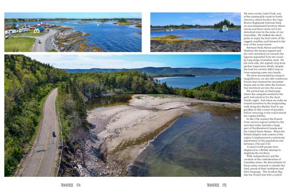 We were on the Cabot Trail , one of the unmissable roads in North America , which borders the Cape Breton Highlands National Park , an uncontaminated territory where moose and bears seem not to be disturbed even by the noise of our motorbike . We walked the short paths to enjoy the best views of the rugged coastline and listened to the roar of the ocean waves .