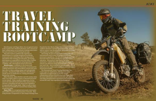 The International Travel Training Bootcamp USA is now open for registration , offering motorcycle enthusiasts an opportunity to join this unique collaboration between MotoDreamer and Rogue Moto . For more information and to secure your spot , please visit https :// motodreamer . com / motorcycle-tours / tour-byterrain / off-road / 7-day-expedition-bootcamp-usa /